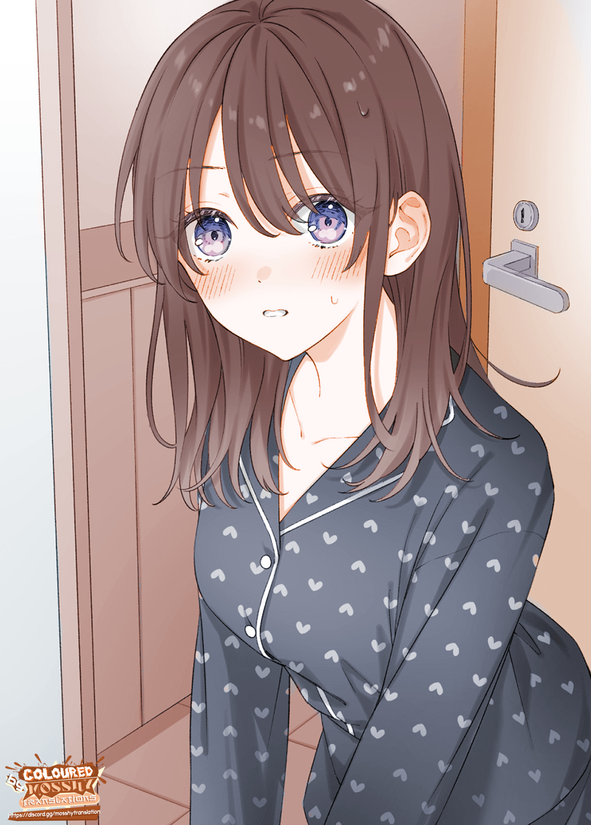 She instantly retreated into the entrance, leaving the door ajar with the box wedged in the gap. Her face peeked out, hands frantically smoothing her bangs.