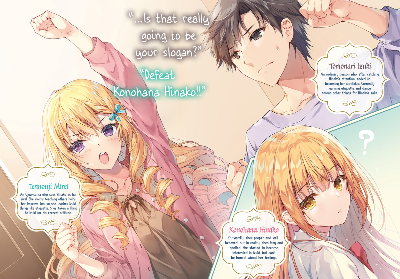 A high school boy, Itsuki Tomonari, gets involved in a kidnapping and ends up taking care of Hinako Konohana, a young lady from one of Japan’s largest conglomerates. On the surface, Hinako seems to be a brilliant and charming girl, but in reality, she is a lazy girl with no life skills. However, due to family reasons, Hinako has to play the role of the “perfect young lady” at school. Wanting to protect her, Itsuki takes care of her in a very caring manner. Eventually, Hinako begins to fawn on Itsuki with all her might… “Now…if Itsuki isn’t around, I would hate it.” This is a love story that begins with a cute young lady with a gap that transcends the master-servant relationship.