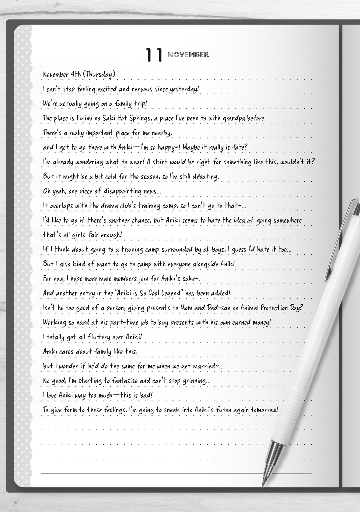 “Trip with Aniki ♪ Hot springs with Aniki ♪” she sang under her breath, swinging our linked arms with infectious enthusiasm.