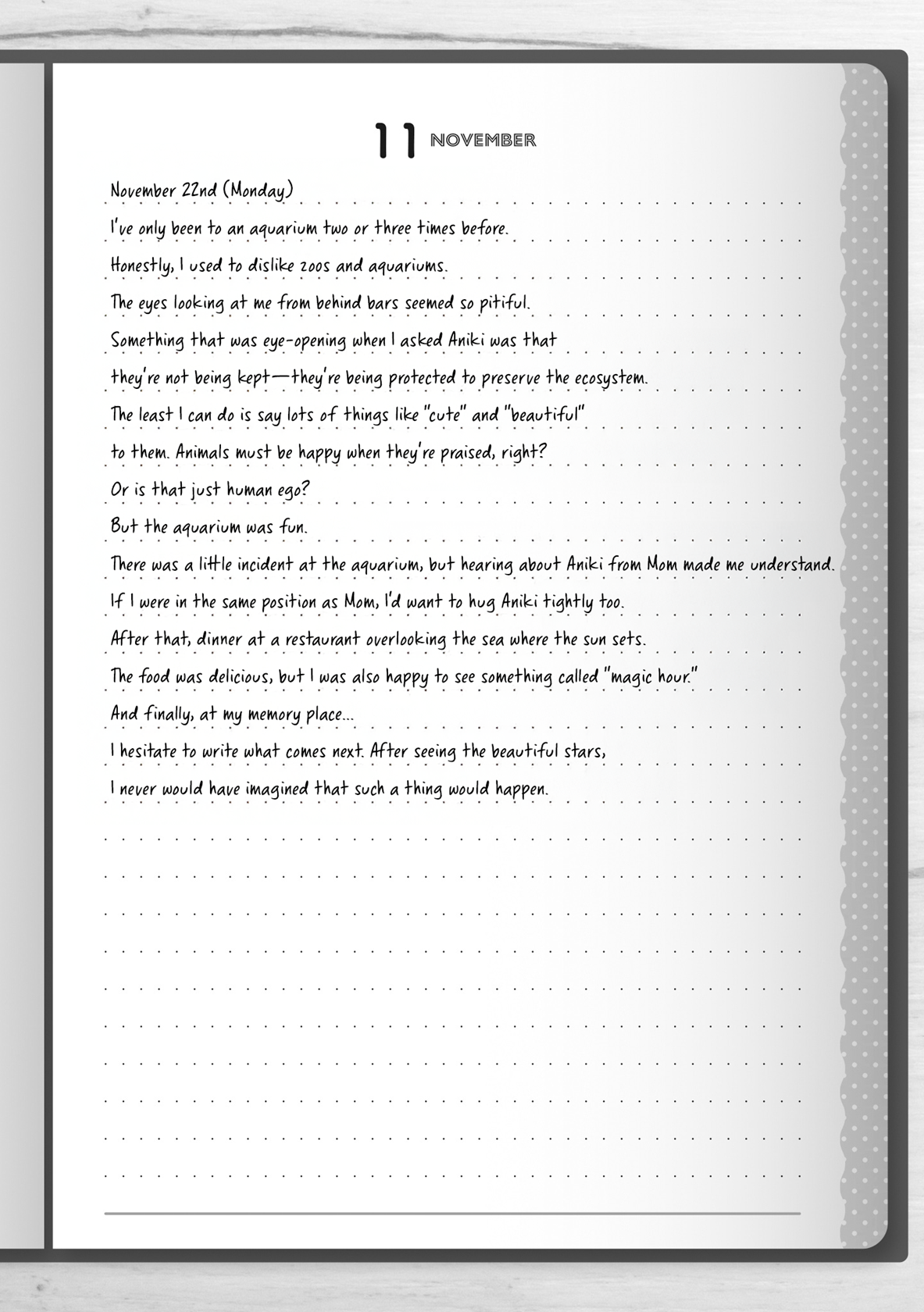 —Sorry, I’ve always been terrible at Japanese. And my handwriting’s messy too… It’s really an awful composition, but it contained everything I could think of as hard as possible back then, so please don’t laugh, okay?